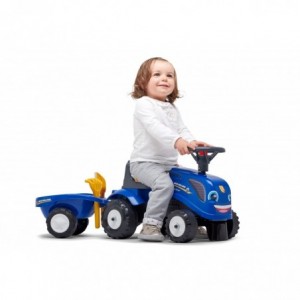 • New Holland ride-on and push-along tractor equipped with a directional steering wheel with a horn, a mini trailer with a shovel and a rake and 2 customization kits included. Including a customizable license plate