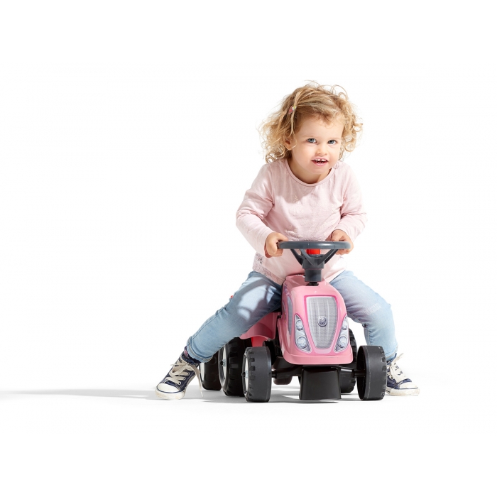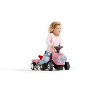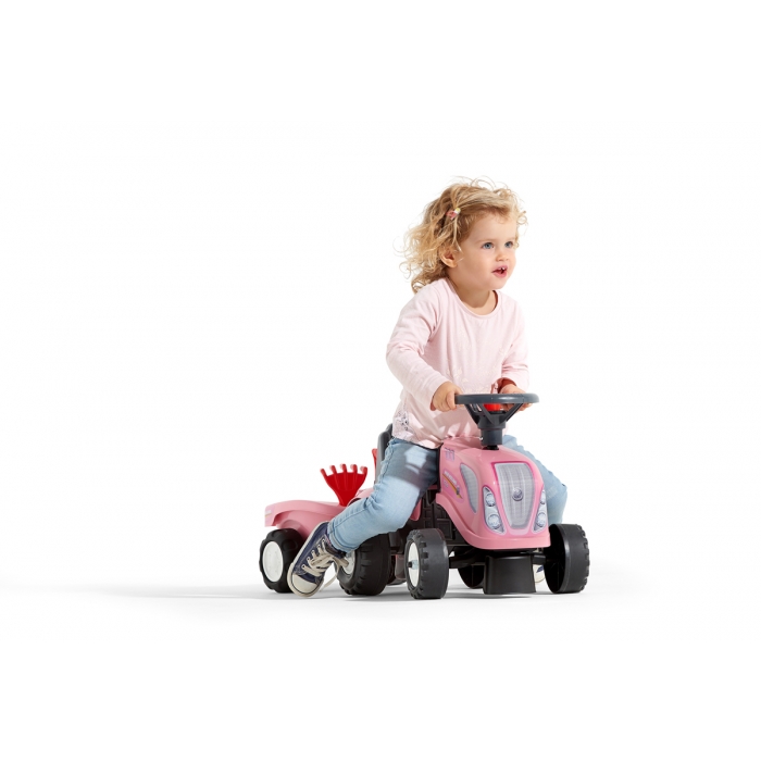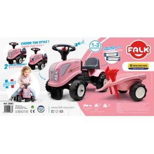 New Holland Pink tractor, Ride-on and push-along, 100% made in France for toddlers from 1 year old. Fun with its shapes all in curves this little vehicle will make little gardeners happy. Its bright colors are perfect for awakening your baby, which can also develop their motor skills and balance while having fun! As well as in the garden or inside thanks to its directional steering wheel with horn, this little tractor is very cute equipped with a trailer with shovel and rake will be their preferred means of transporting their favorite blanket from the bedroom in the living room or in small outdoor getaways, the sandbox! Smart, an extra adhesive kit included allows your toddler to choose the style and to customizable the license plate!