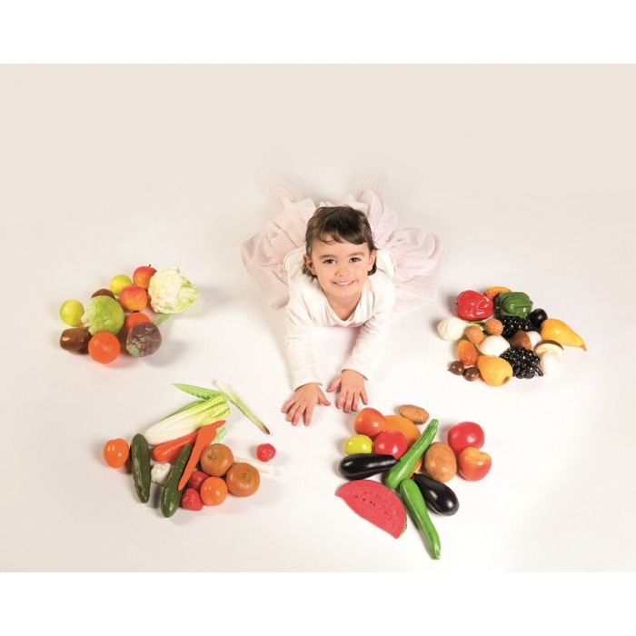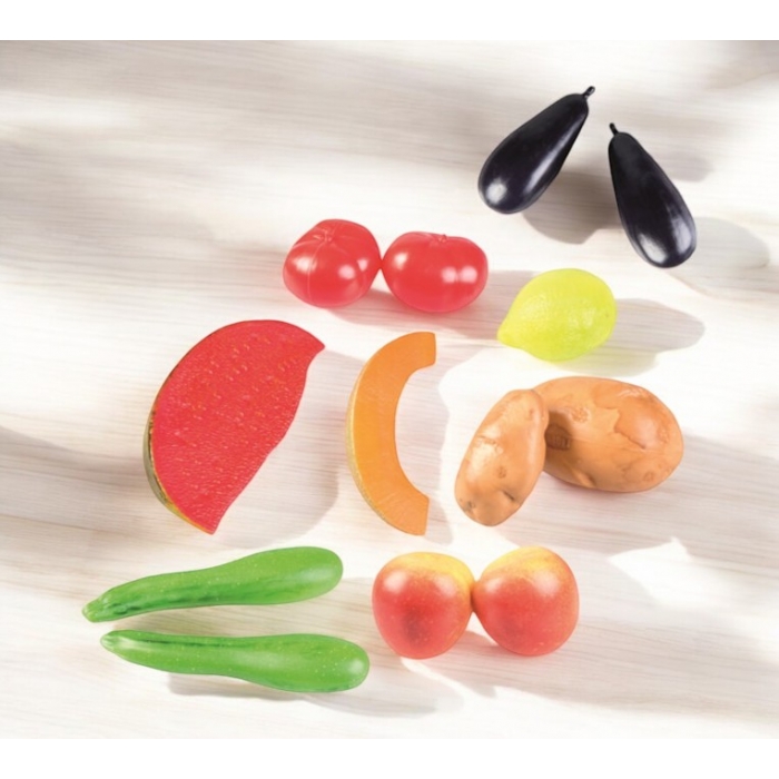 - 13-piece realistic fruits & vegetables play food set: 1 slice of cantaloupe melon, 1 slice of watermelon, 2 potatoes, 2 eggplants, 1 lemon, 2 tomatoes, 2 peaches, and 2 zucchinis.