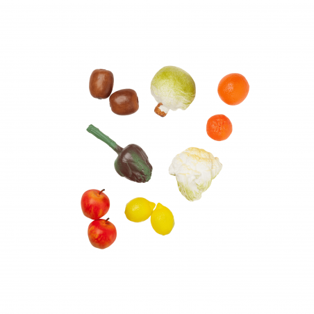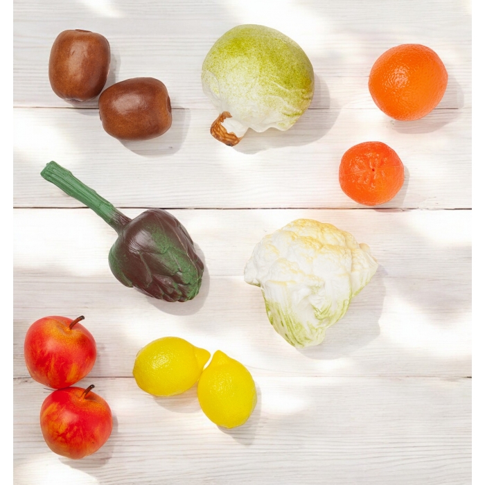 - 11-piece realistic fruits and vegetables play food set: 2 kiwis, 2 lemons, 1 orange, 1 tangerine, 2 apples, 1 cauliflower, 1 green cabbage, and 1 artichoke.