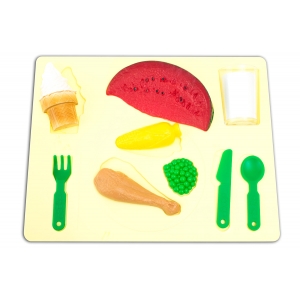 - Complete set including 1 chicken drumstick, peas, 1 corn on the cob, 1 slice of watermelon, 1 glass of milk, 1 ice cream cone, cutting utensils (knife, fork, and spoon), and a yellow serving tray.