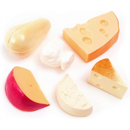 - 6-Piece play food set: 1 Swiss slice, 1 provolone pear, 1 mozzarella, 1 Emmenthal quarter, 1 half camembert, and 1 Hollander cheese slice.
