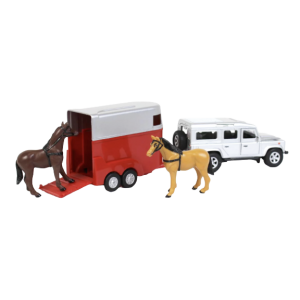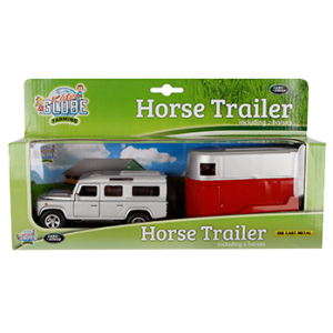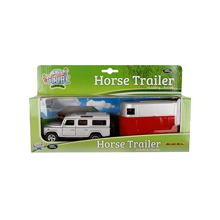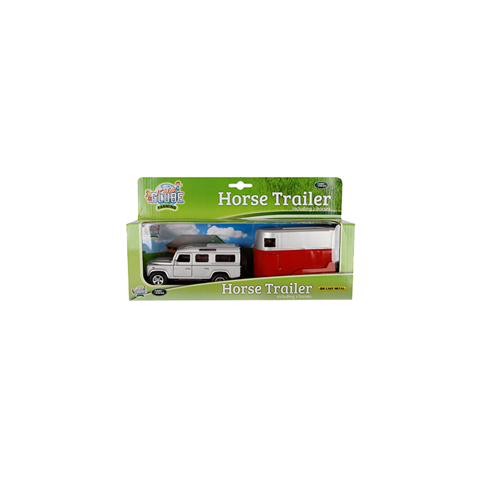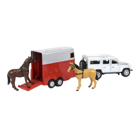 This silver Land Rover Defender in diecast, 1:32 scale, will drive the 2 horses in the red/silver trailer wherever you want! The vehicle has a pullback action for more fun to play! Delivered with two horses 1:32 scale. The Land Rover and trailer are made of metal and plastic parts for durability.