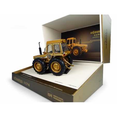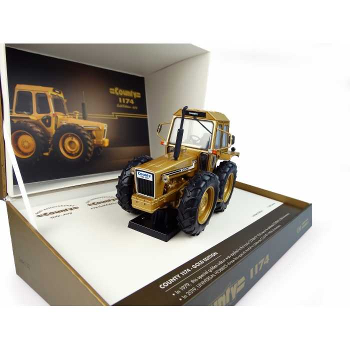 - Faithful reproduction of the Ford County 1174 die-cast tractor in Gold Edition from Universal Hobbies, capturing an authentic and impressive look.