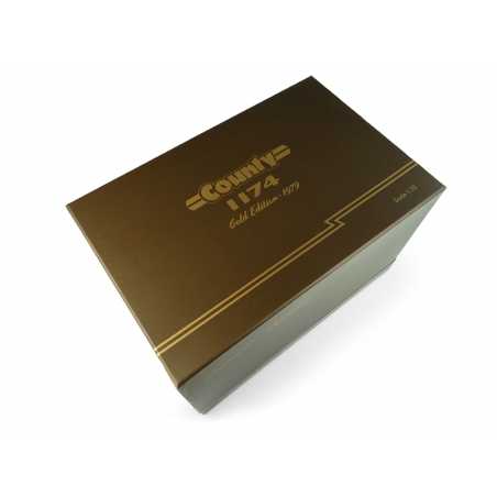 The unique limited edition in "Gold" for the Ford County 1174 tractor from Universal Hobbies is a great addition to your collection of agricultural models. Featuring an exclusive color scheme, "Gold," this limited-style edition stands out for its rarity and iconic design. This color is to commemorate the 50th Anniversary Model, 1929-1979. In 2019, Universal Hobbies chose this special model to celebrate the county's 90th anniversary. This model comes in a premium box, making it a highly collectible display piece. Every detail has been carefully crafted, from the sculpted hood design with headlights fixed on both sides and realistic cabin interior to the lights, mirrors, and realistic working rear third-point linkage. system. The deep-tread rubber tires add true-to-life realism, while the die-cast metal construction ensures long-lasting quality. A must-have for tractor enthusiasts, collectors, and agricultural professionals who value exclusivity.