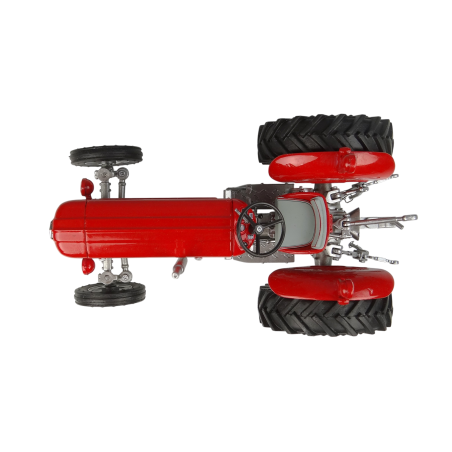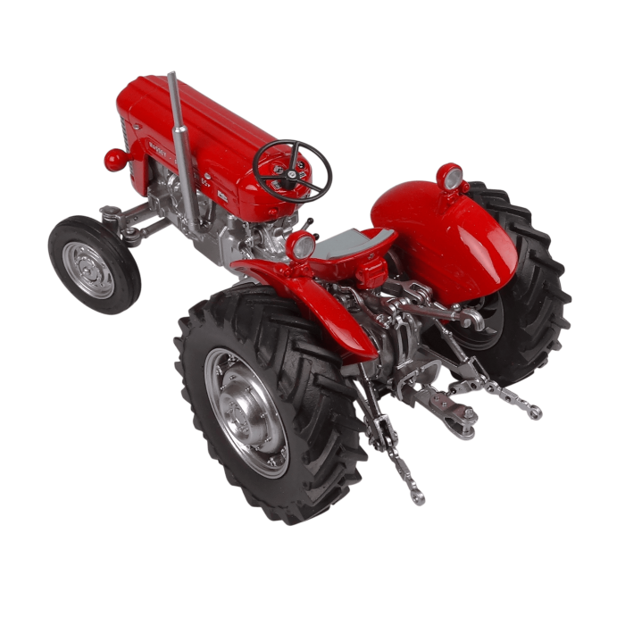 - Features realistic detailed engine components, aspecific European front grille, MF logo tampoprinted, a rubber cushion seat with red piping, a steering wheel, rear adjustable third-point linkage and movable linkage, and deep-tread rear rubber tires with an engraved pattern for a true-to-life finish.